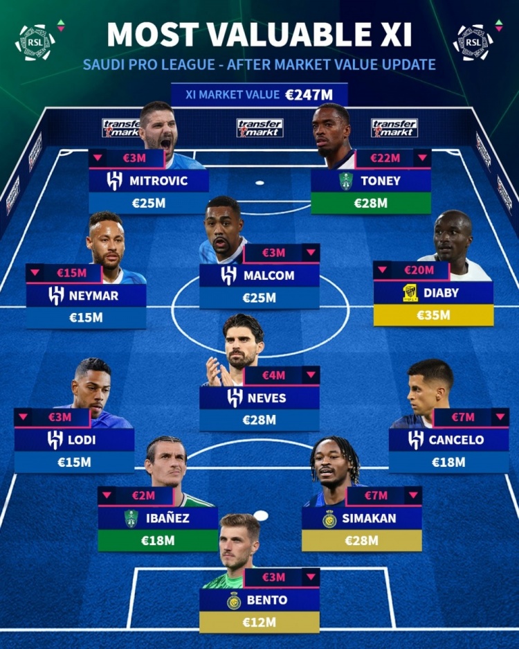 12月14日訊 德國轉會市場更新了沙特聯(lián)賽球員的身價,并列出身價最高陣容,內馬爾、米特洛維奇、伊萬-托尼在列,總價2.47億歐元。