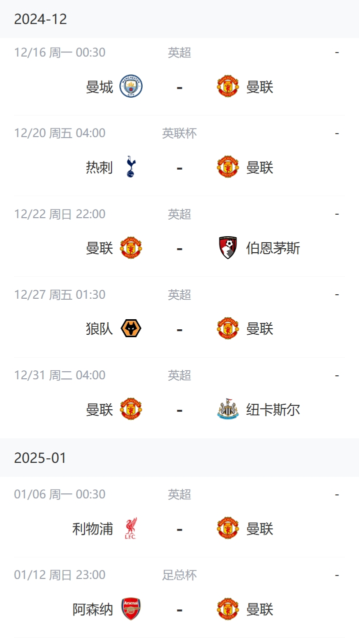 發(fā)布時(shí)間:2024年12月14日 18:01點(diǎn)擊:欄目:足球新聞 除特別注明外,本站所有內(nèi)容均為24直播網(wǎng)整理排版,轉(zhuǎn)載請(qǐng)注明出處:能贏幾場(chǎng)?曼聯(lián)曼市德比后賽程:熱刺、紐卡、利物浦、阿森納 本文標(biāo)簽: 英超 曼聯(lián) 阿森納 曼城 利物浦 熱刺 紐卡斯?fàn)?/a> 足球