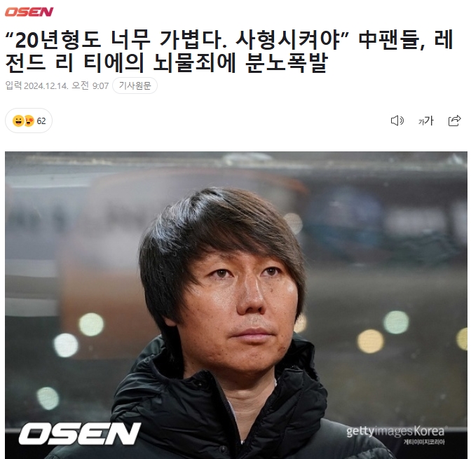 12月14日訊 昨日湖北省咸寧市中級人民法院一審對原國足主帥李鐵判處有期徒刑二十年,韓媒OSEN繼續(xù)關(guān)注該案件。