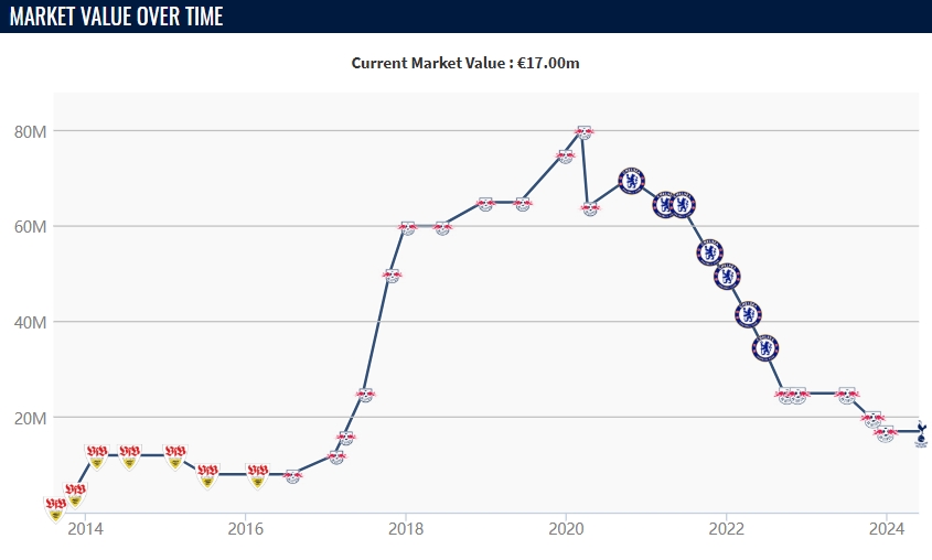 值得一提的是,這位德國前鋒本賽季為球隊(duì)出場19次,僅僅在聯(lián)賽杯打進(jìn)過一球,目前球員德轉(zhuǎn)身價(jià)為1700萬歐元。在2020年效力萊比錫時(shí),維爾納身價(jià)一度達(dá)到8000萬歐元,這名德國國腳也在2020年以5300萬歐元轉(zhuǎn)會(huì)費(fèi)加盟切爾西。雖然跟隨球隊(duì)捧起了歐冠獎(jiǎng)杯,但他在藍(lán)軍表現(xiàn)始終未能達(dá)到預(yù)期,維爾納也在2022年以2000萬歐轉(zhuǎn)會(huì)費(fèi)重回萊比錫,并在今年1月份租借加盟熱刺。