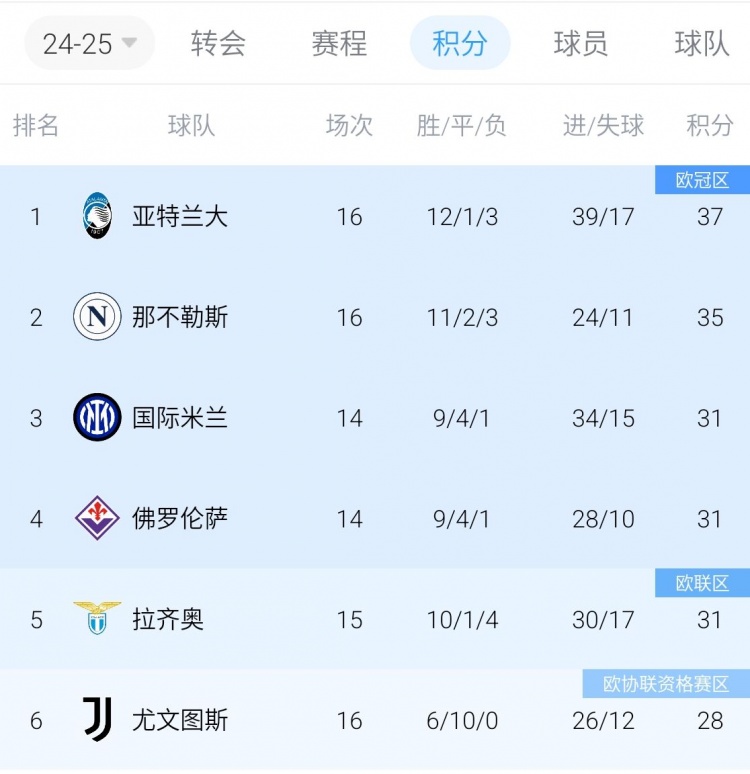 少賽一場(chǎng)的拉齊奧15輪吃到了4場(chǎng)敗仗,但憑借10勝1平領(lǐng)先尤文3分。積分榜排名第一、第二的亞特蘭大和那不勒斯,分別都吃到了3敗。
