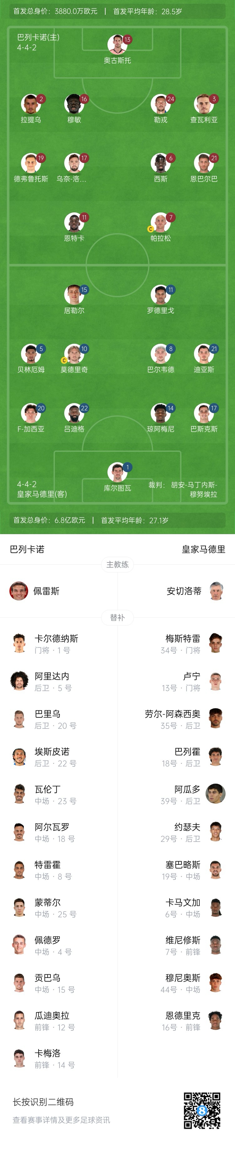 皇馬替補:13-盧寧、34-梅斯特雷、6-卡馬文加、7-維尼修斯、16-恩德里克、18-巴列霍、19-塞巴略斯、29-約瑟夫、35-勞爾-阿森西奧、39-洛倫佐-阿瓜多、44-維克托-穆尼奧斯