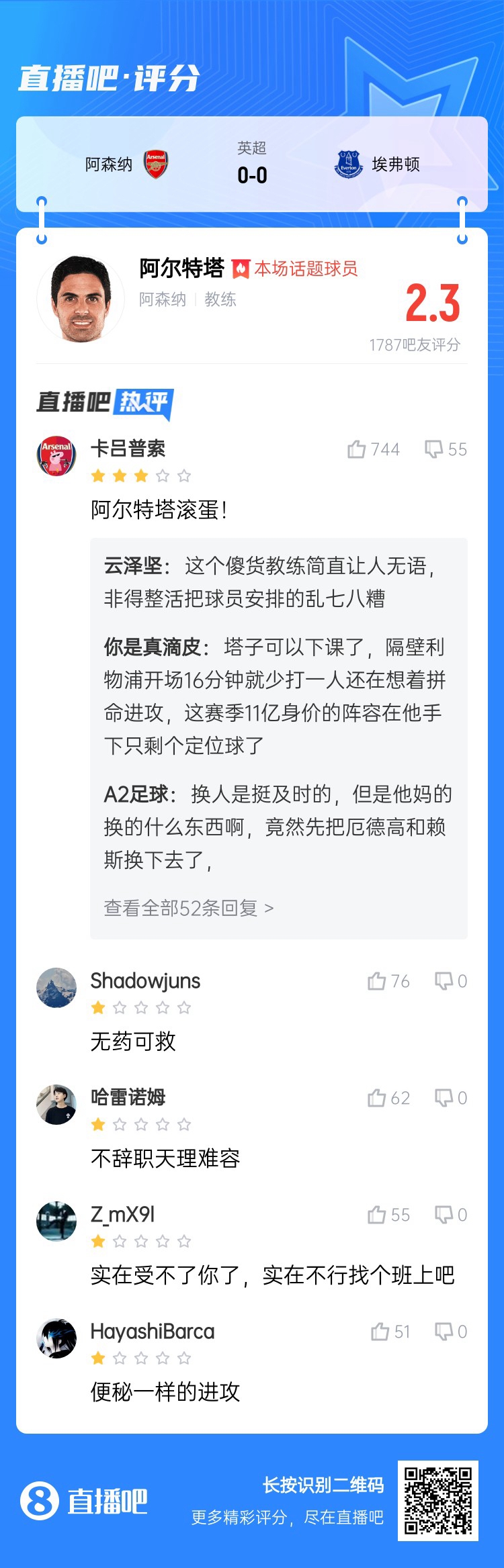 除特別注明外,本站所有內(nèi)容均為24直播網(wǎng)整理排版,轉(zhuǎn)載請注明出處:2.3分!吧友怒批阿爾特塔:不辭職天理難容,進攻便秘