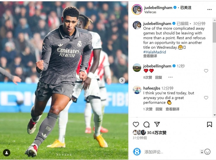 賽后貝林厄姆在社交媒體上曬出比賽照片,并寫道:“這是較為艱難的客場比賽之一,但我們應(yīng)該帶著不止一分離開?!?/p>