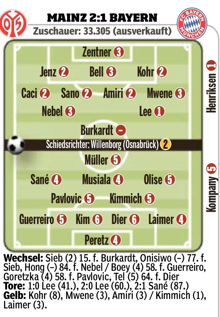 12月15日訊 在德甲第14輪比賽中,拜仁客場(chǎng)1-2不敵美因茨,德國(guó)媒體《圖片報(bào)》對(duì)兩隊(duì)球員進(jìn)行了評(píng)分。
