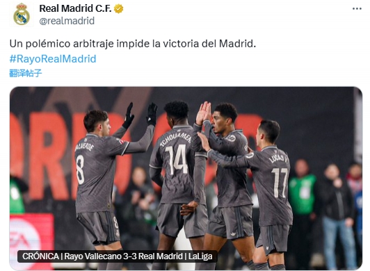 皇馬社媒和戰(zhàn)報(bào)直接標(biāo)題抗議判罰:“一個(gè)有爭議的判罰阻止了皇馬獲勝?!?/p>