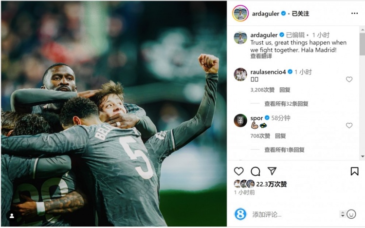 賽后居勒爾在社交媒體上寫道:“相信我們,當(dāng)我們并肩作戰(zhàn)時(shí),美妙的事情就會(huì)發(fā)生,Hala Madrid!”