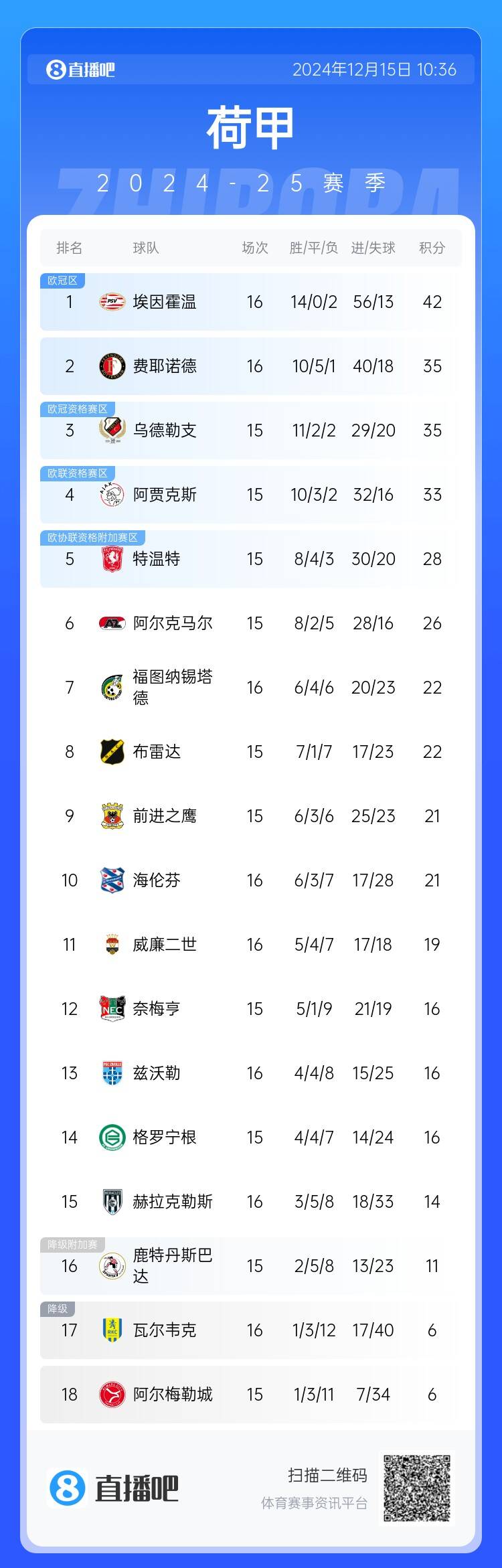 12月15日訊 荷甲第16輪比賽,海倫芬1-0力克埃因霍溫,荷甲巨無霸PSV吃到本賽季的第二場敗仗,仍7分領(lǐng)跑荷甲。