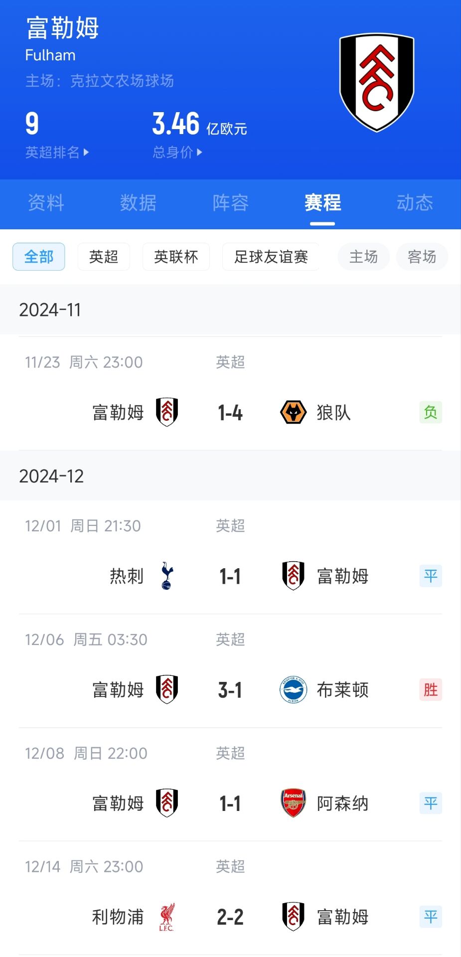 目前富勒姆排在英超第9位,距離暫列英超第4的森林只有4分。